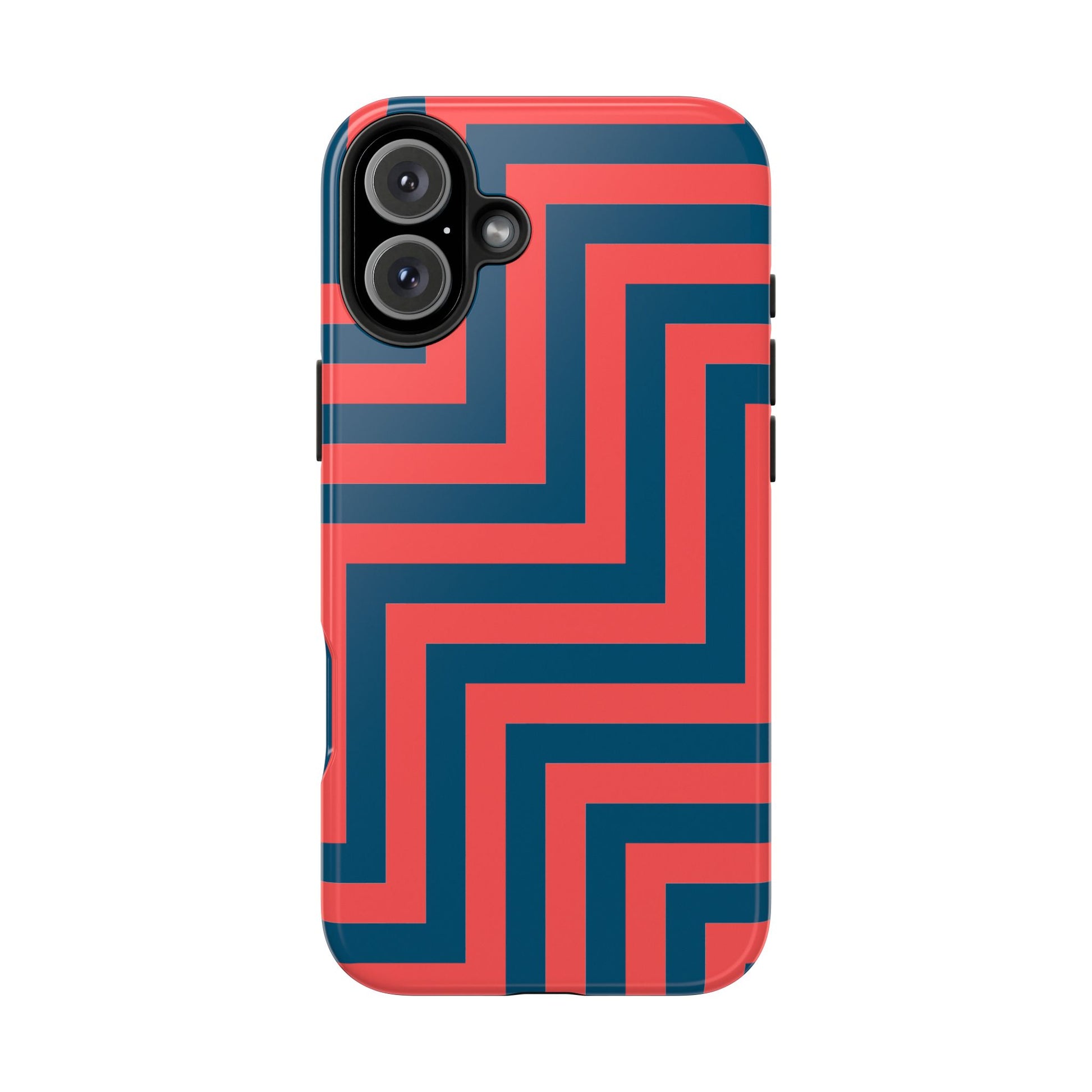 A stylish Coral Red and Dark Teal zig zag patterned iPhone case that offers excellent protection against drops and tears. The design gives off a modern and trendy vibe, perfect for adults looking to accessorize their phone. Ideal for those who want a durable and impact-resistant phone case that also looks fashionable. Great for everyday use or as a gift for tech-savvy friends and family. Suitable for holidays, birthdays, and special occasions.